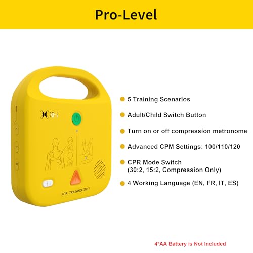 3 CPR FREQUENCY MODES & 4 SUPPORTIVE LANGUAGES & BOX CONTENTS: 100/110/120 beep per minute, and the beep sound can be turned off. This AED trainer can be selected in English, Italian, French, Spanish, which meet people who speak different languages. The box contains AED Trainer, 2 Pair Adult/Child Electrode Pads, Wire Connector, Storage Bag, Quick Start Guide